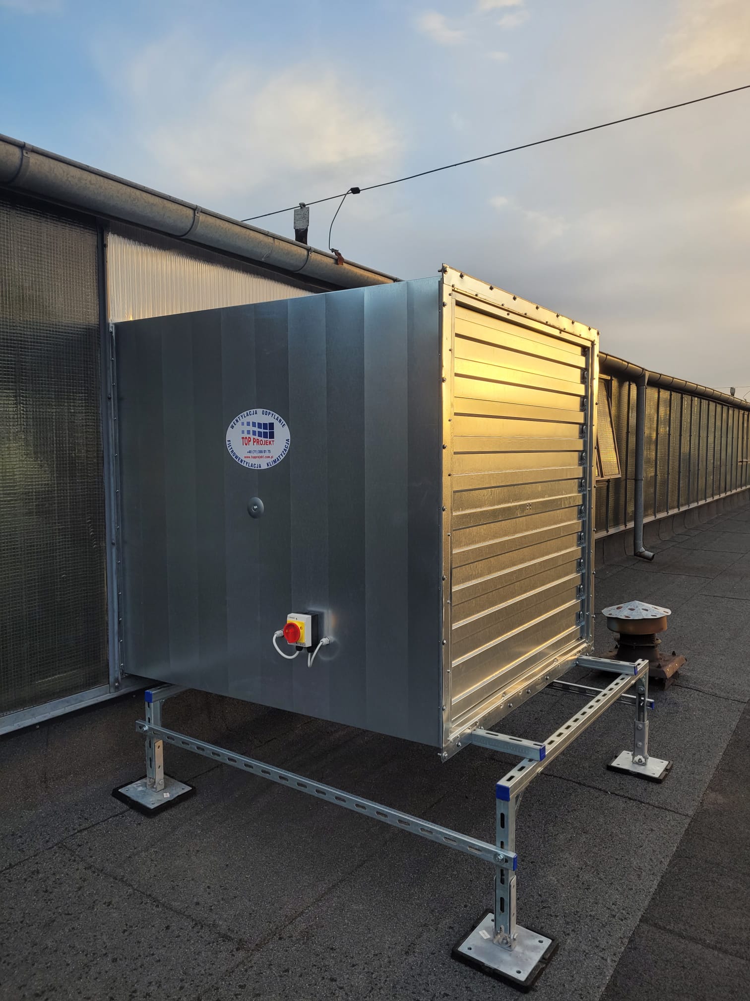 Wentylatory zostały zamontowane w bocznej ścianie świetlika dachowego, czyli w najwyższym punkcie hali, gdzie konwekcyjnie gromadzi się ciepłe powietrze i stąd jest usuwane na zewnątrz.